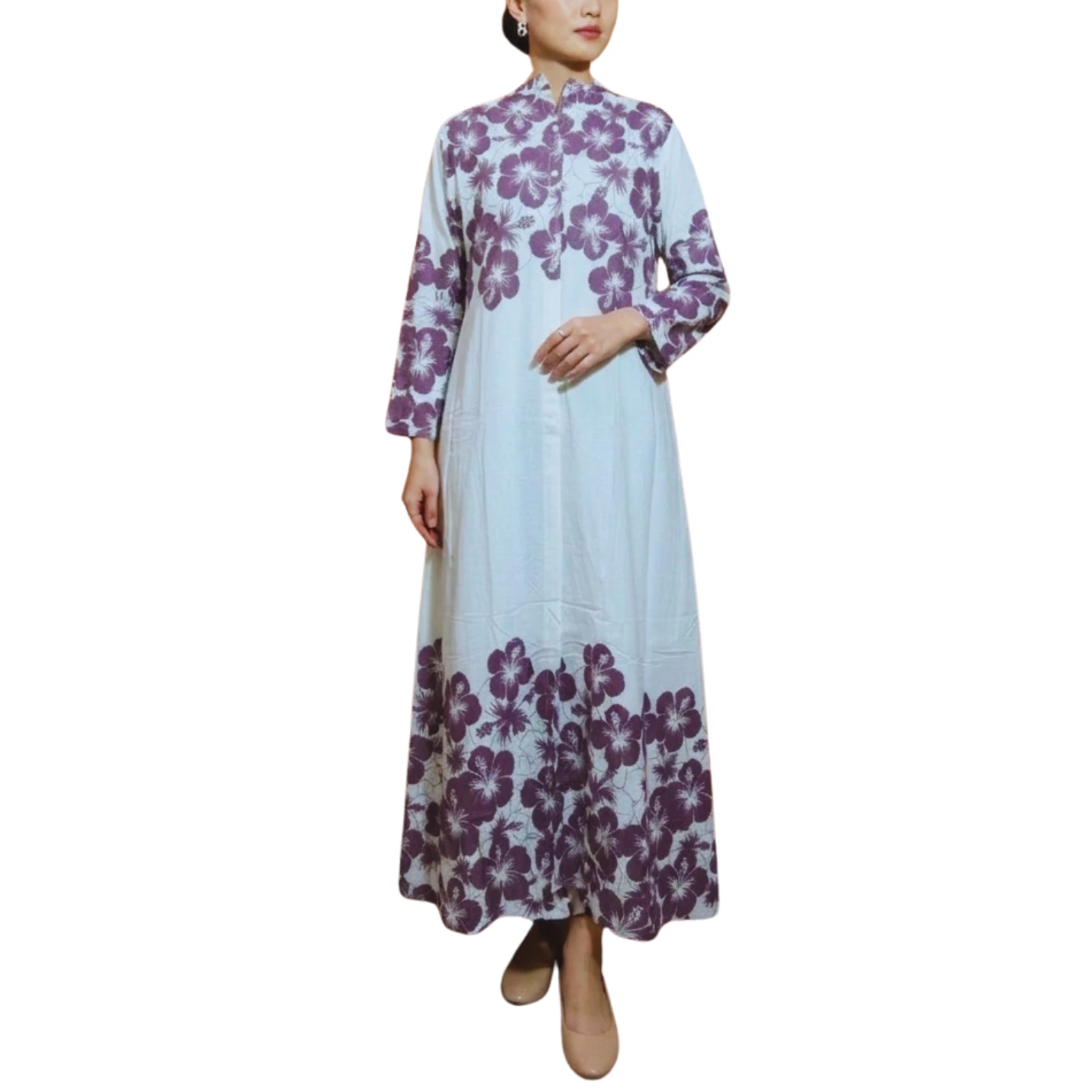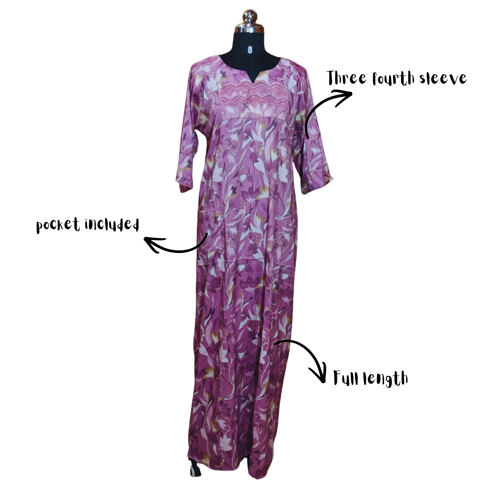 Elegant Floral Comfort: Full-Length Cotton Nightgown with Pockets
