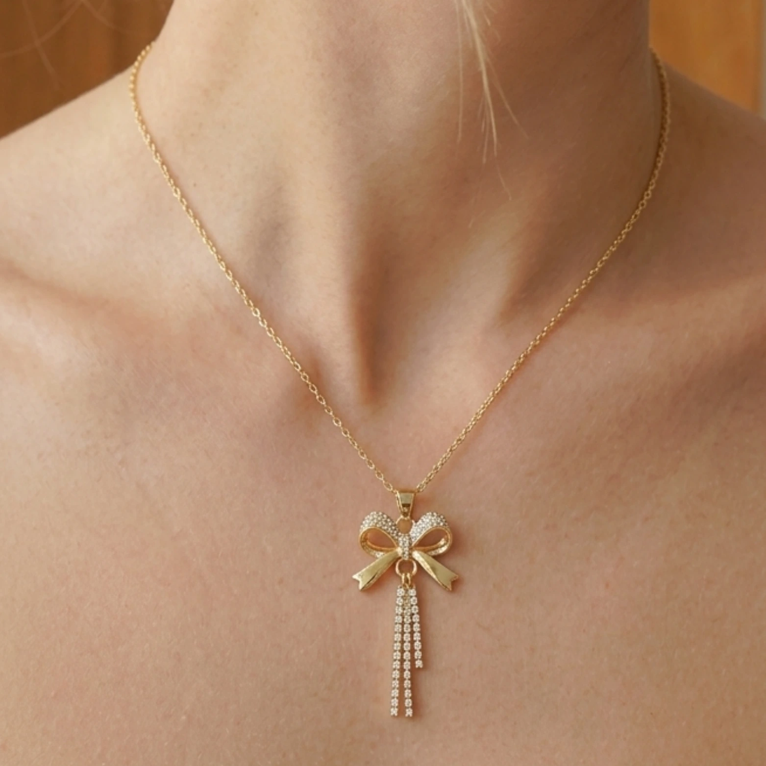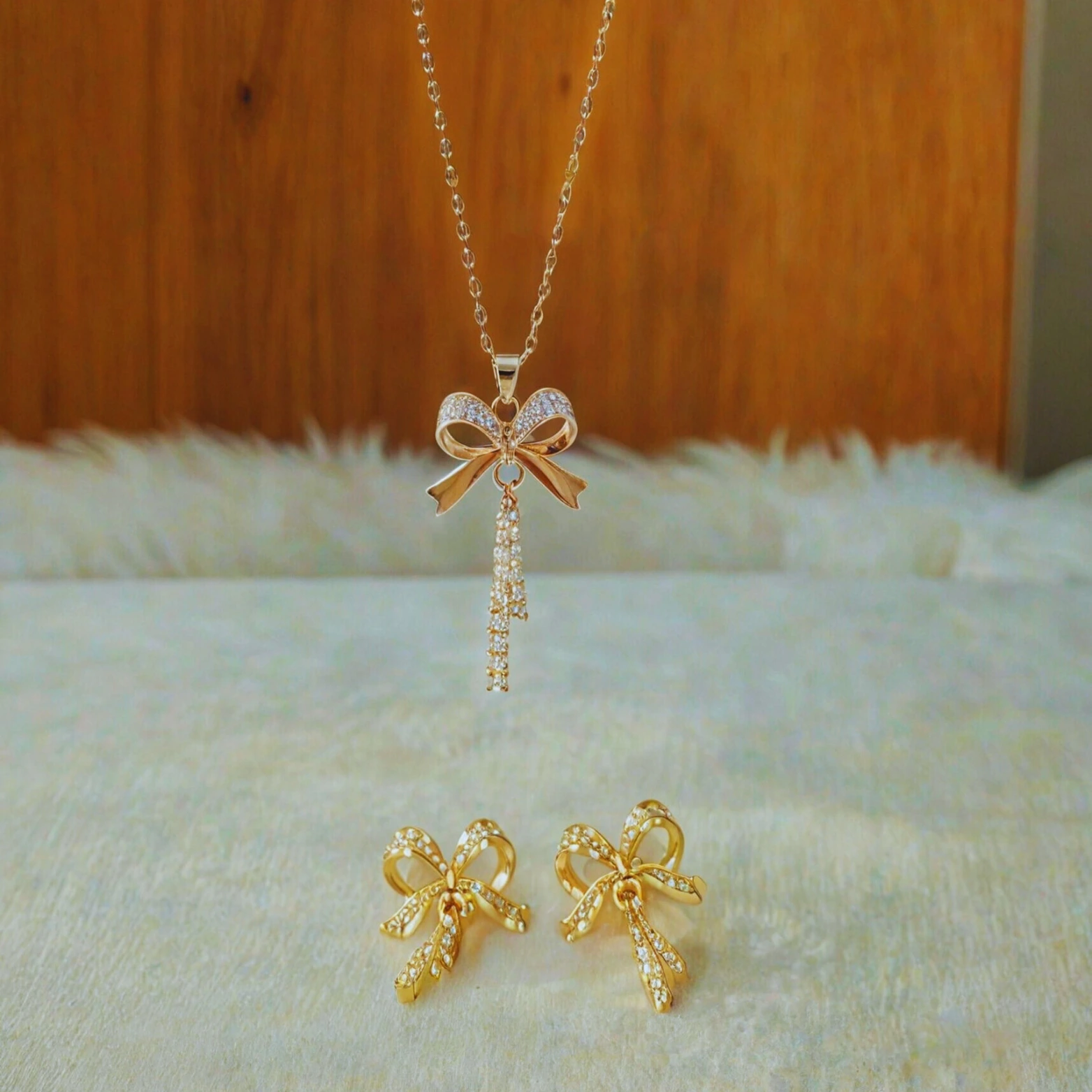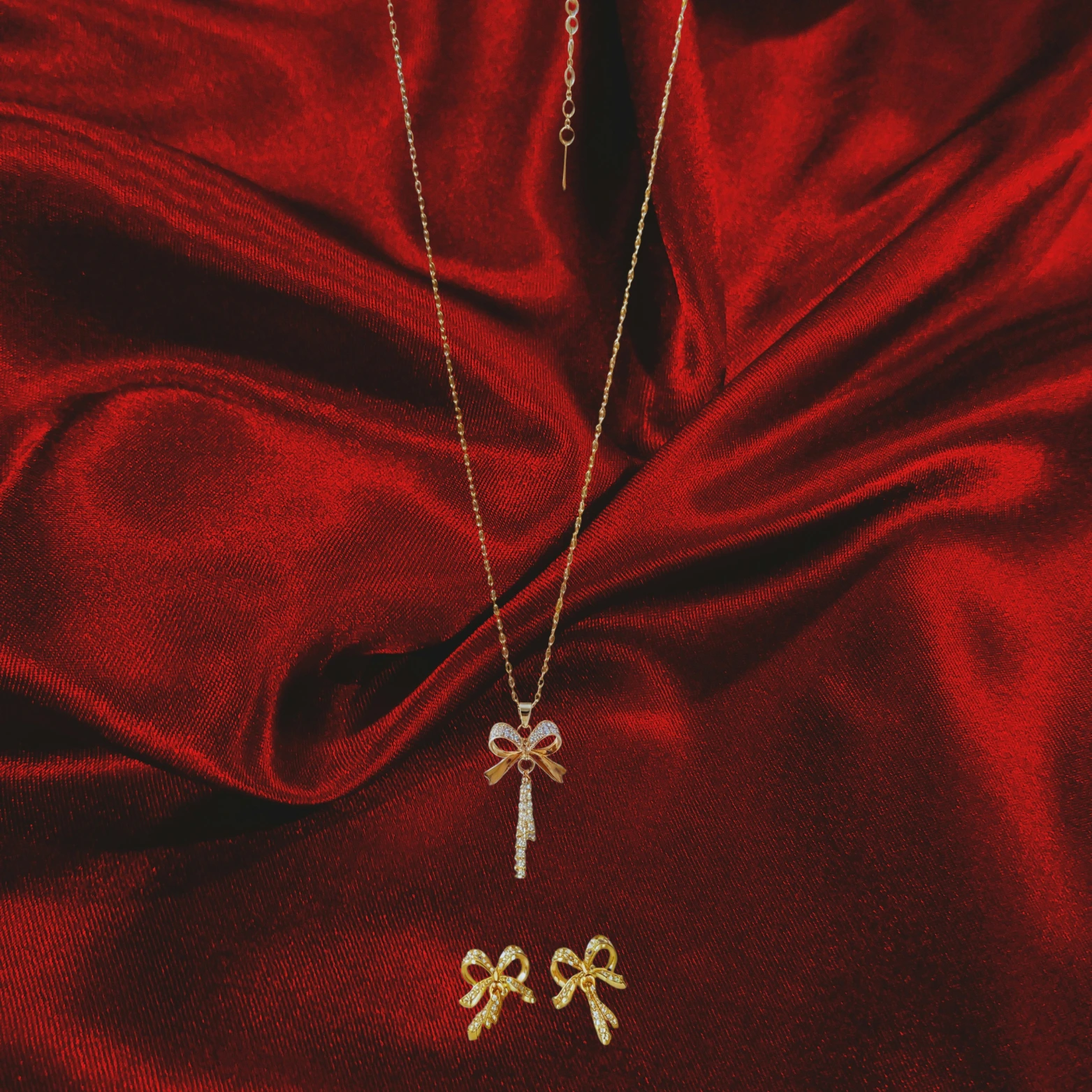 Elevate your everyday style with our Timeless Ribbon Bow Jewelry Set. Embrace the romantic “Coquette” trend with this stunningly detailed set. Our Anti-Tarnish Bow Necklace and Earring Set is designed for the modern woman who refuses to choose between beauty and durability. Each piece features a finely crafted bow encrusted with pave crystals, finished with elegant dangling tassels that catch the light beautifully.