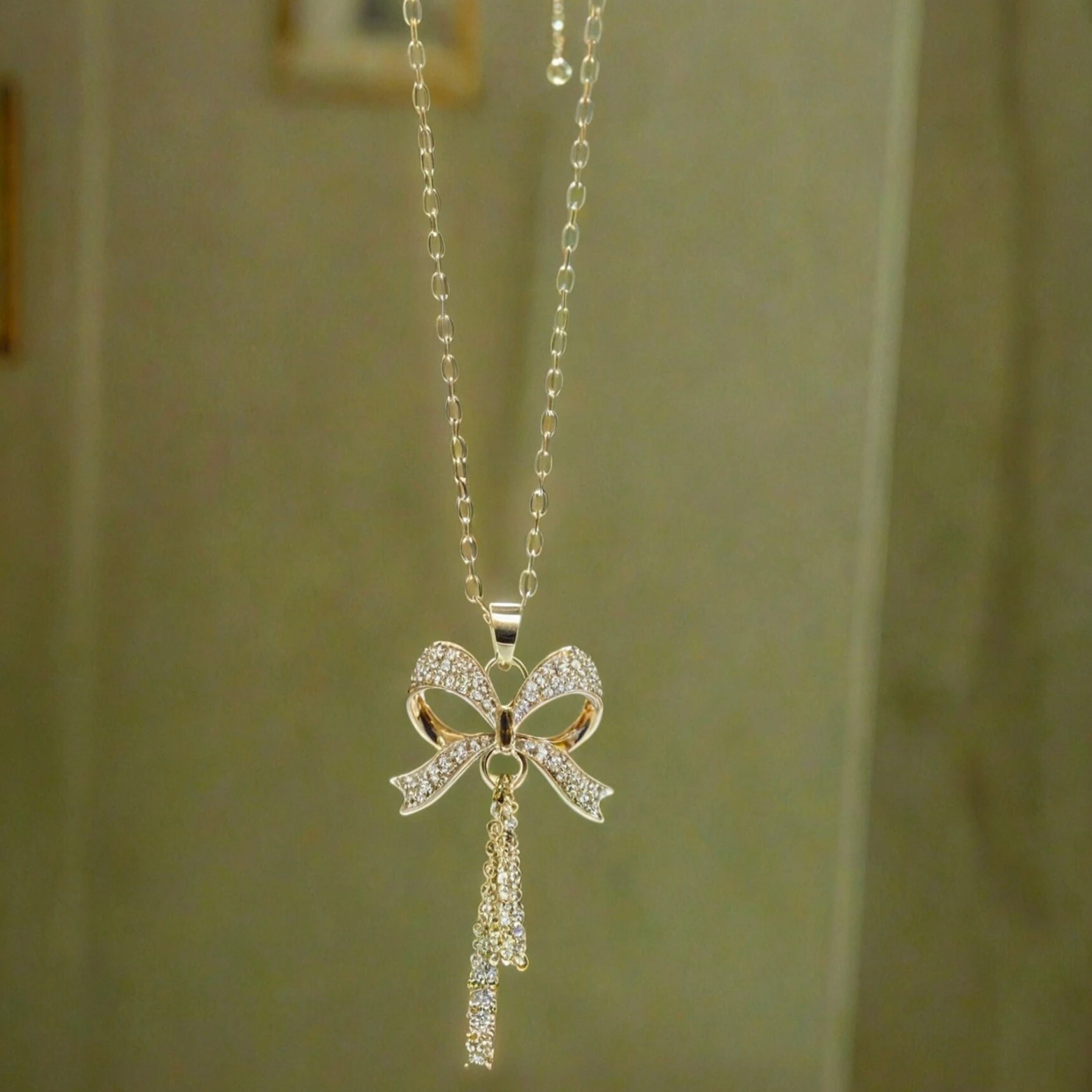 Anti-Tarnish – Tassel Bow Necklace and Tassel Stud Earrings Set | Waterproof Coquette Ribbon Jewelry