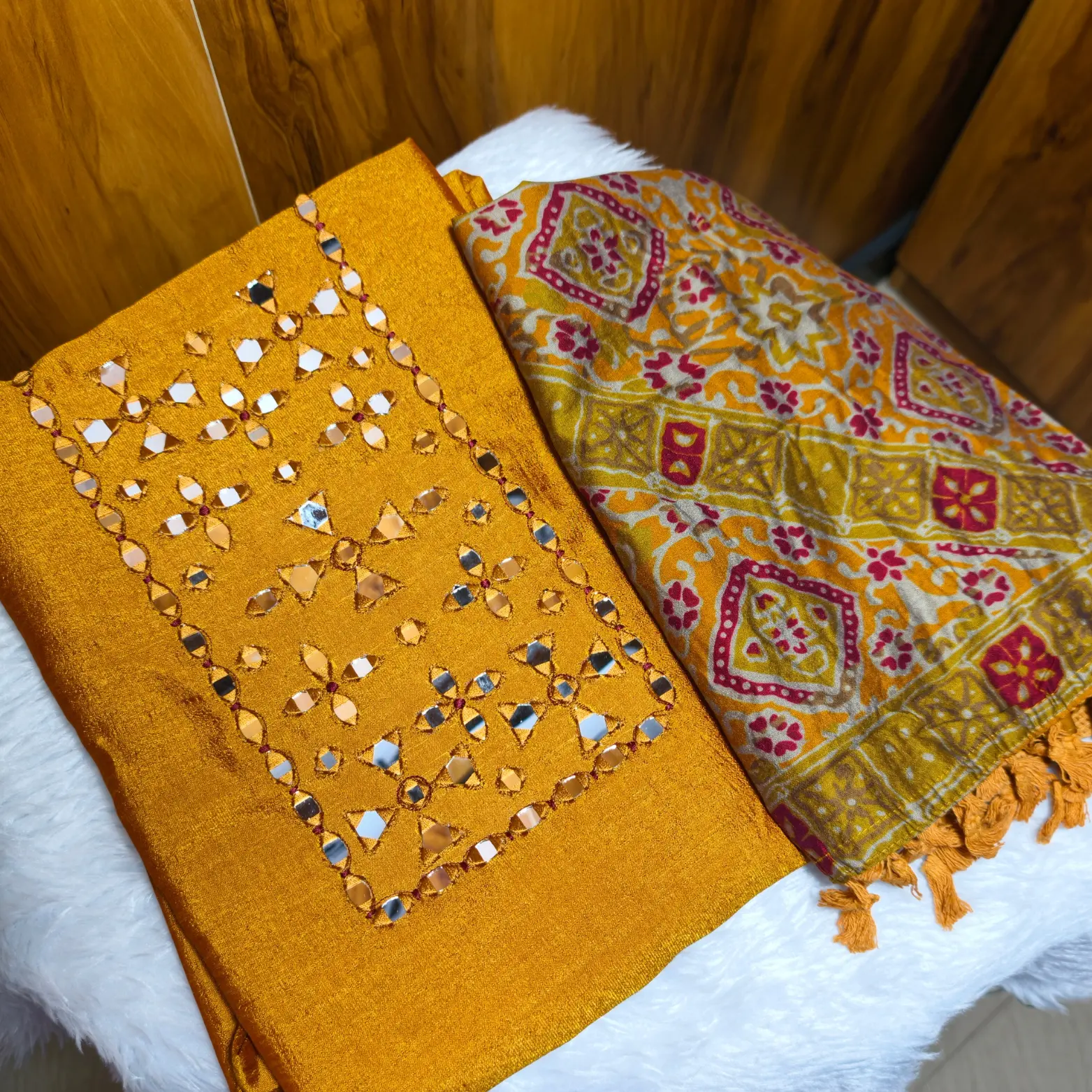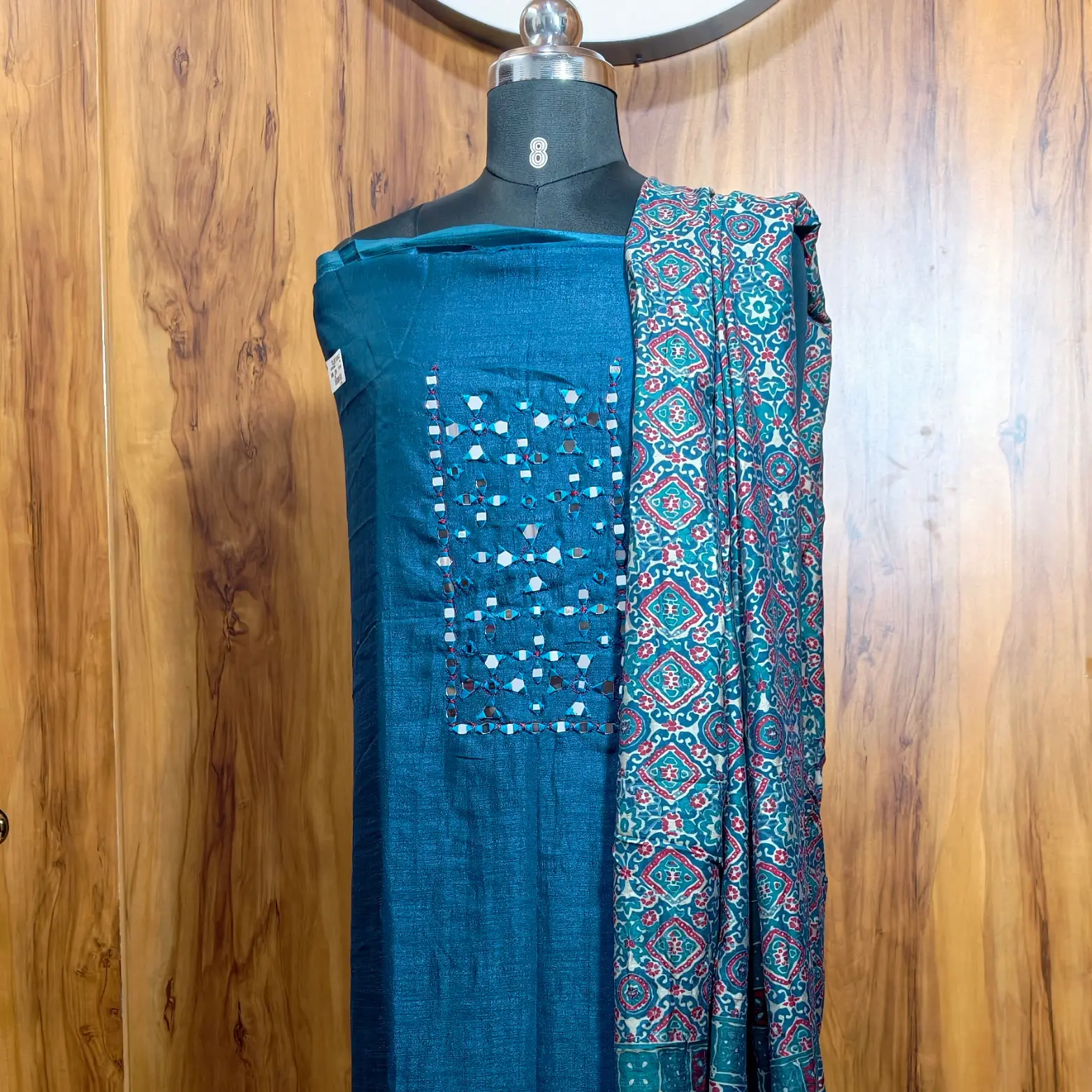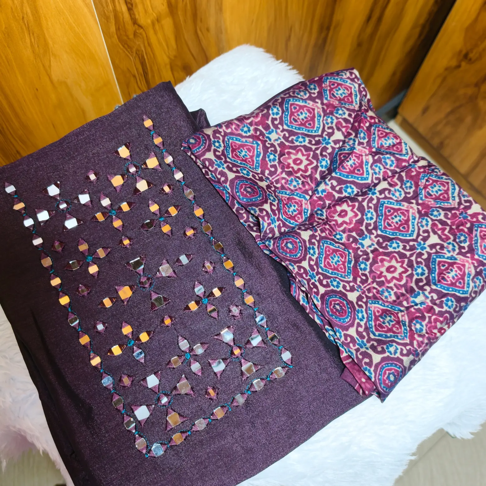 Elevate your ethnic wardrobe with this elegant suit set, beautifully crafted with intricate mirror work detailing on the front panel. The subtle silk of the fabric combined with handcrafted embellishments adds a touch of sophistication and festive charm.