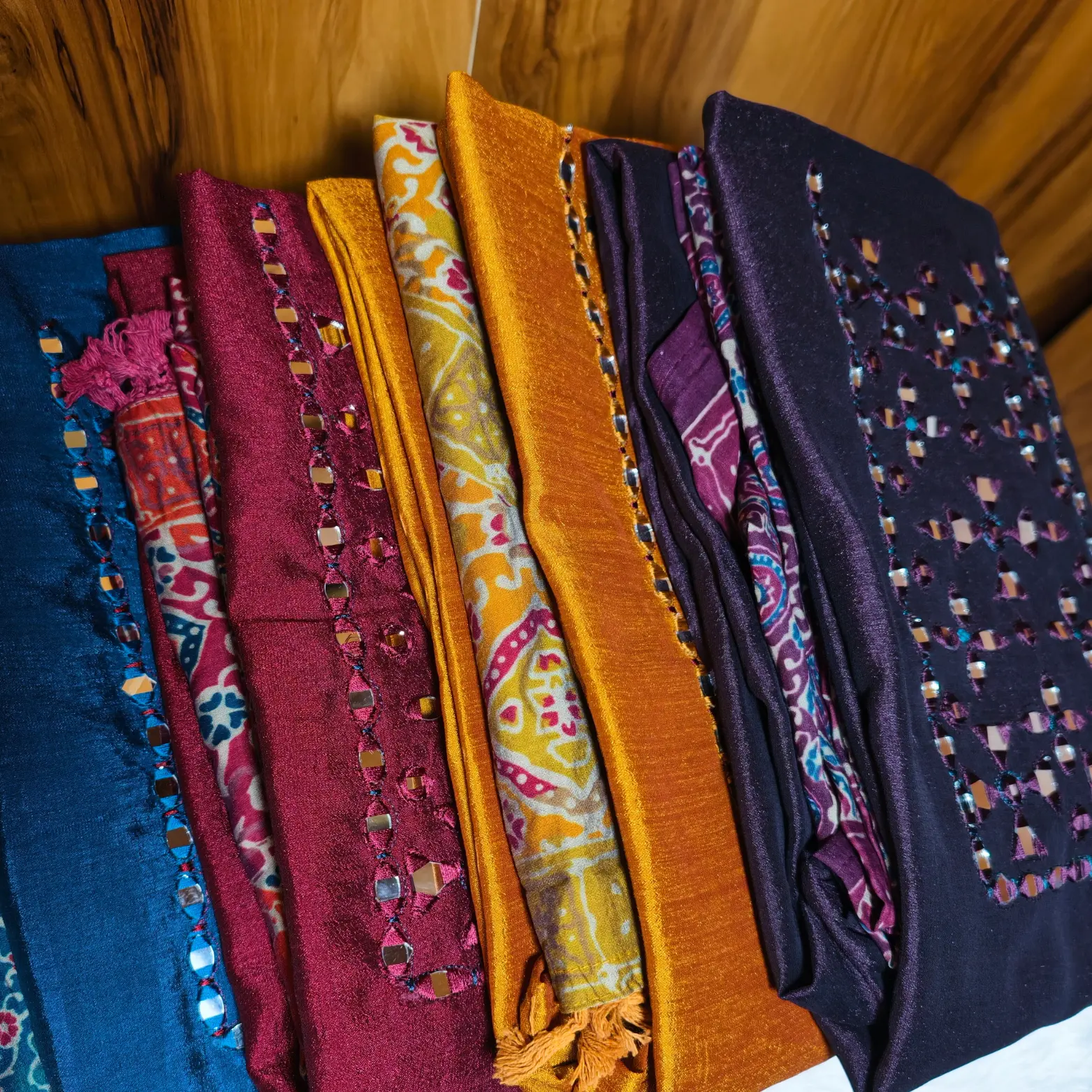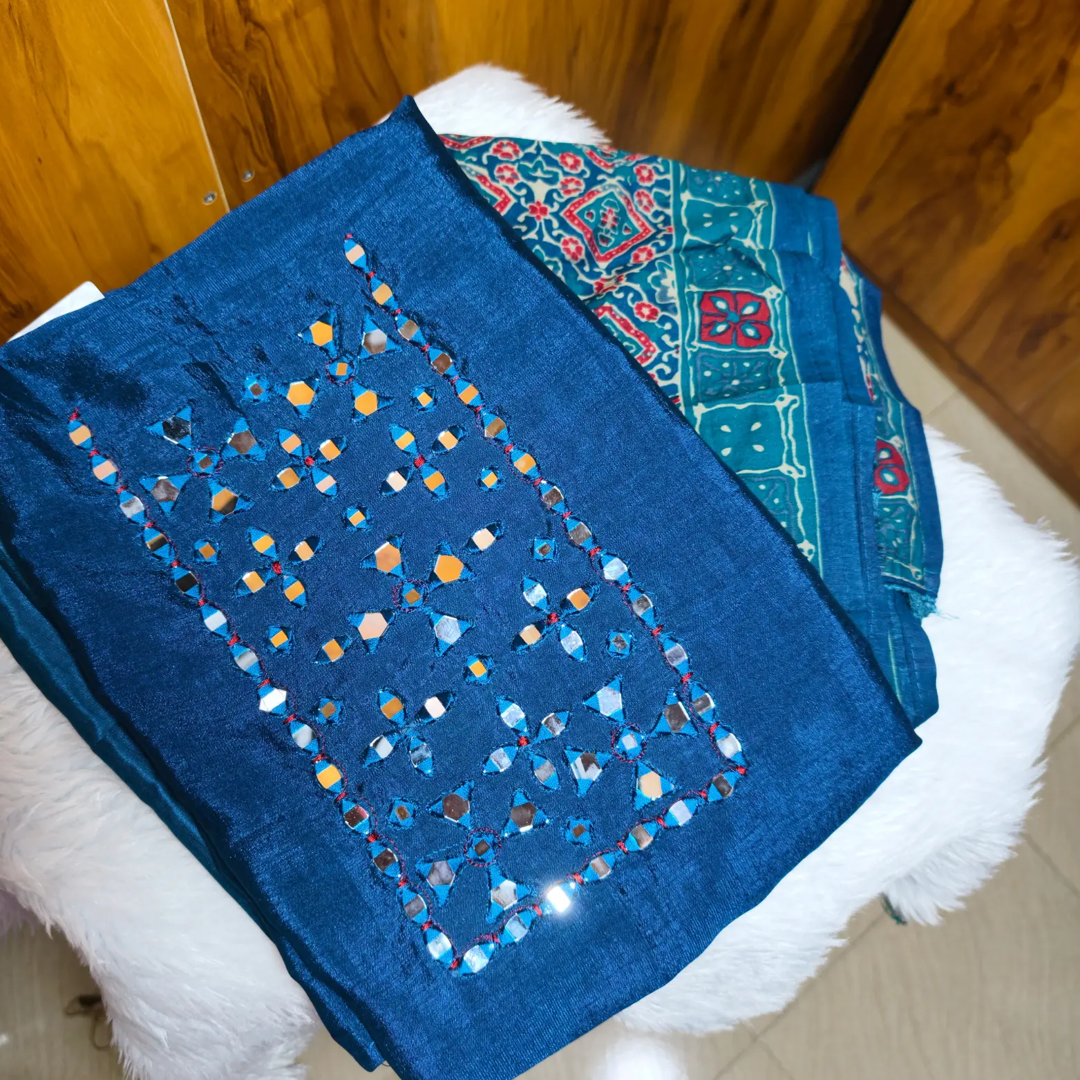 | Workmanship | Handcrafted Mirror Work and thread embroidery on the neckline. |