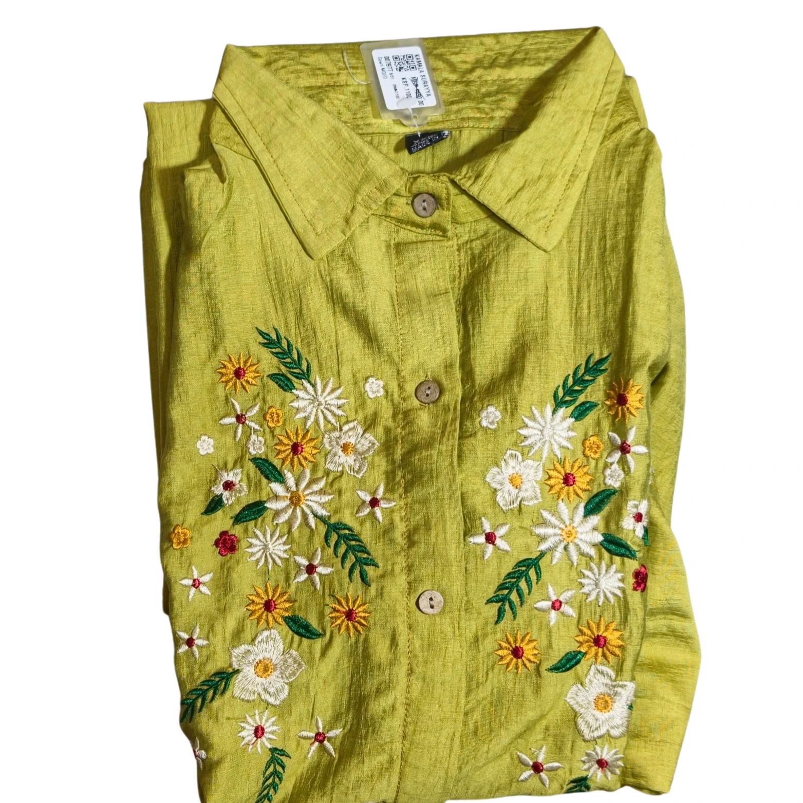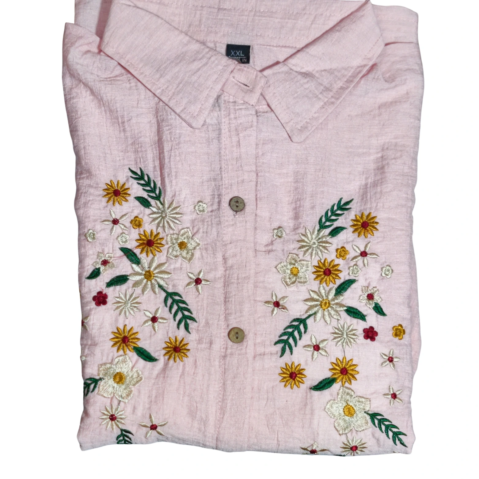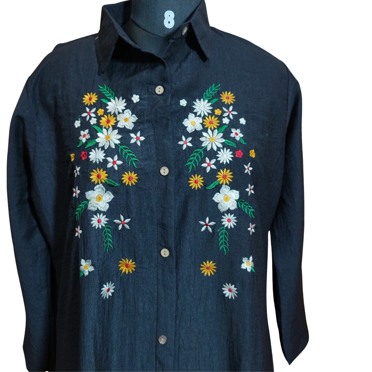 Embroidery: Intricate multi-colored floral detailing across the upper chest, adding a touch of whimsy to the dark fabric.