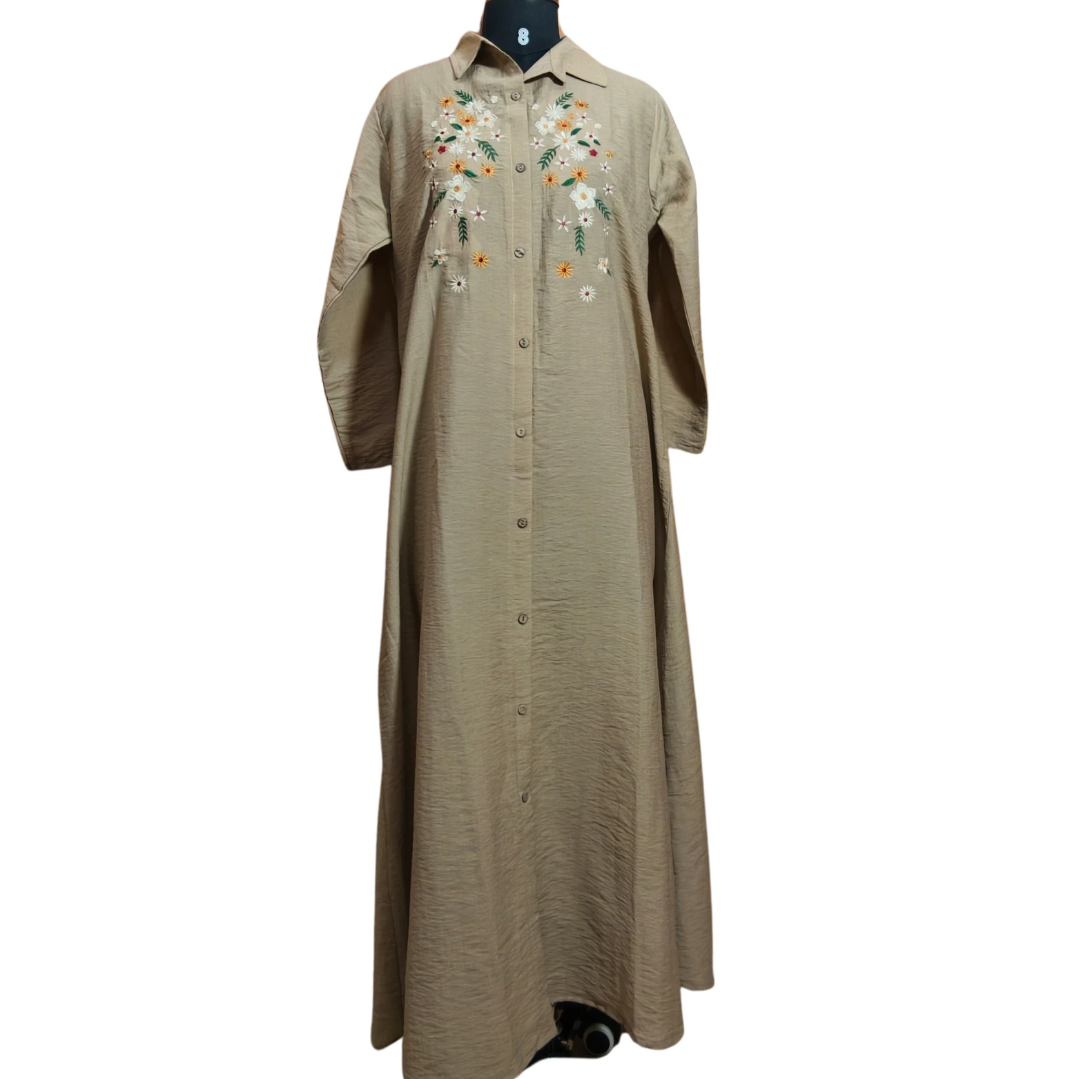 Silhouette: Elegant gown full length that creates a flowing, modest, and elongated aesthetic.