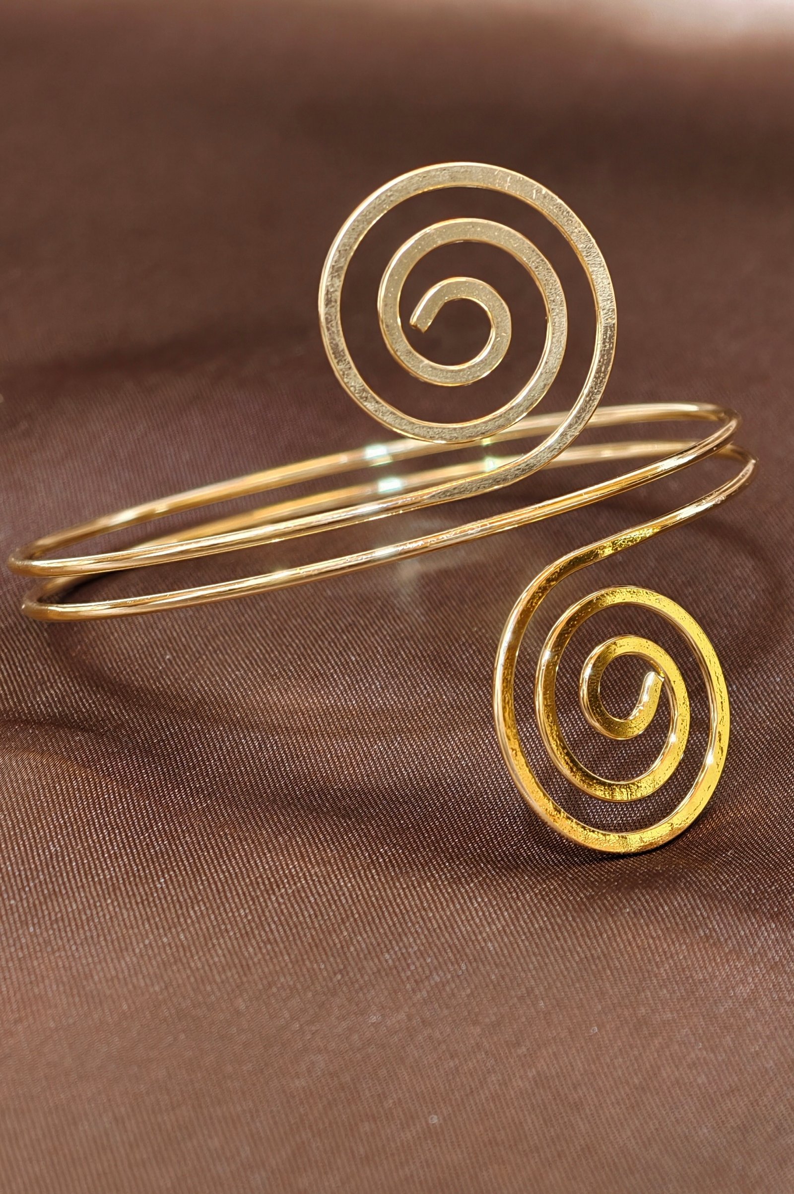 - The items are open-ended, wrap-around arm bracelets featuring intricate, filigree style at one end and a small sphere at the other