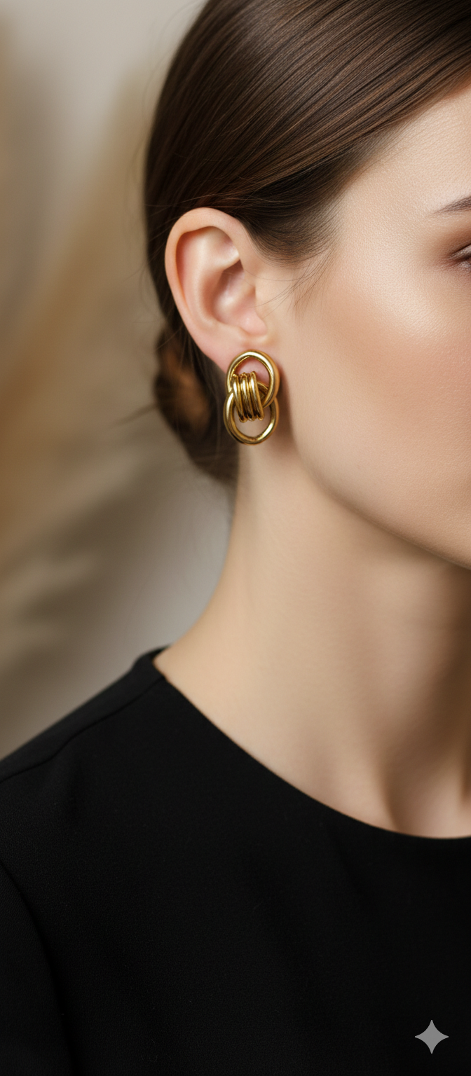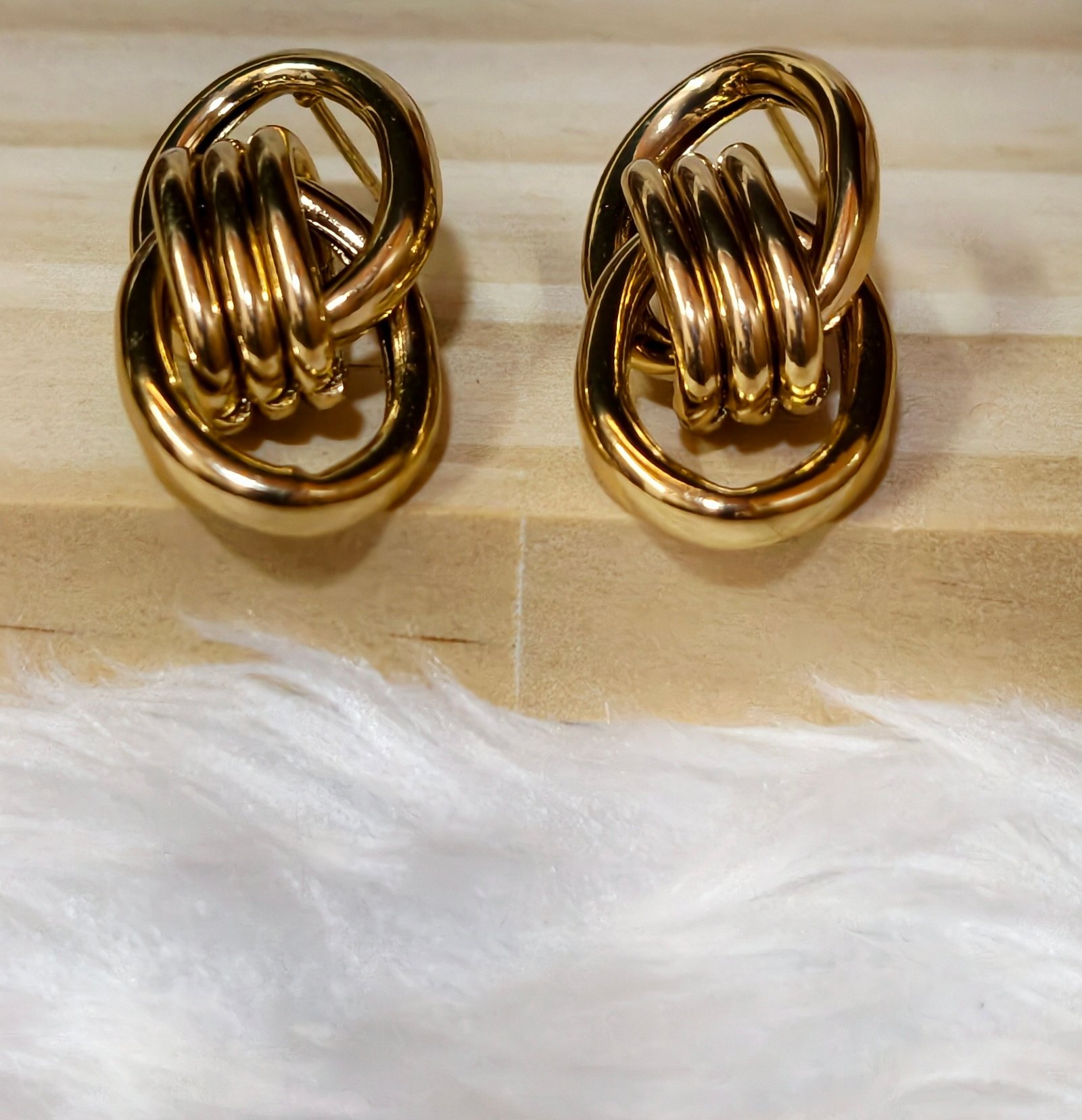 The earrings feature an intricate, twisted knot design that symbolizes unending love and connection. The design involves multiple gold-toned loops interlocked to form a chunky, vintage look.