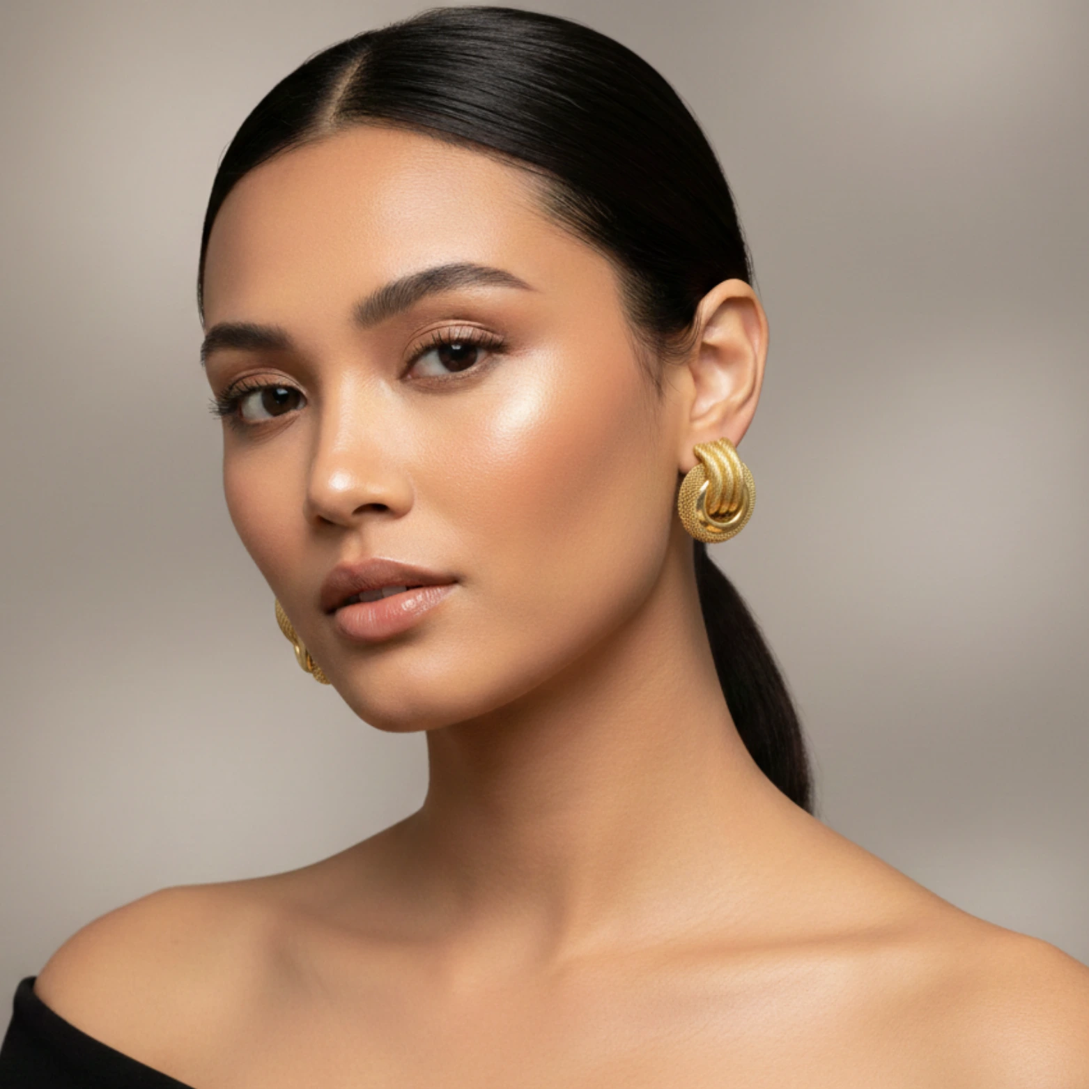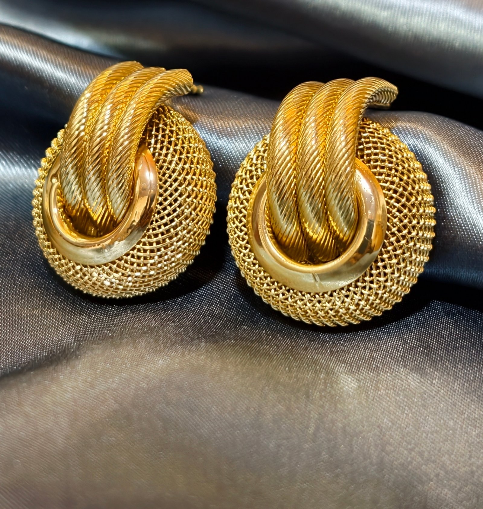 These are large, statement-style stud earrings featuring a bold, sculptural design. The main circular body has a textured, mesh-like finish, with a prominent, thick, twisted rope or knot element looping over the center. They are typically described as vintage or retro fashion style.