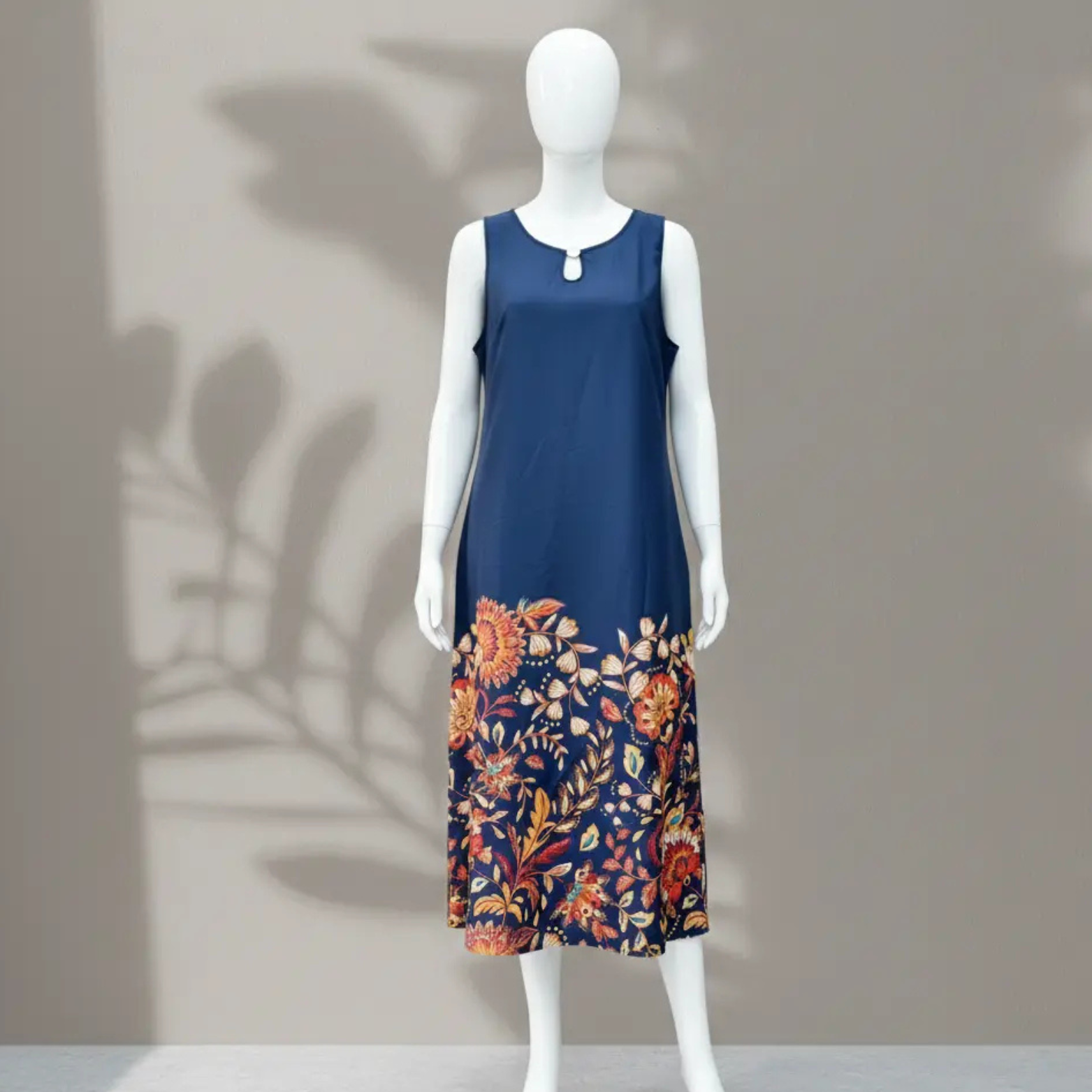 This Navy Blue Floral Border Maxi Dress is a sophisticated addition to your collection. With its elegant sleeveless silhouette and striking orange floral border, it’s a perfect blend of modern style and functional comfort. Since it features a functional keyhole neckline with a front button, it provides convenient access, making it another fantastic feeding-friendly option for your boutique.