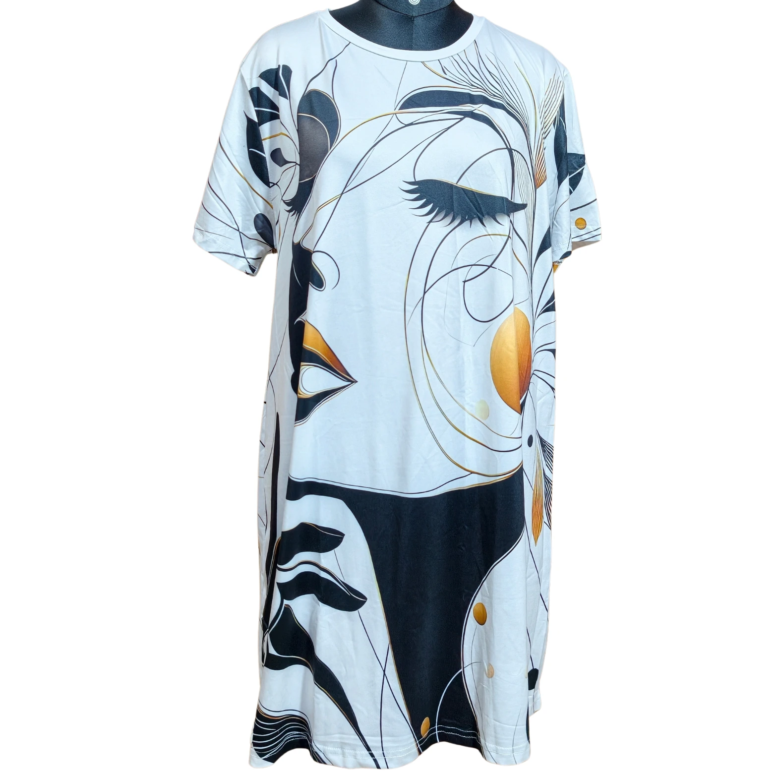 A minimalist white t-shirt dress featuring elegant black line art and shimmering gold-toned circular motifs.