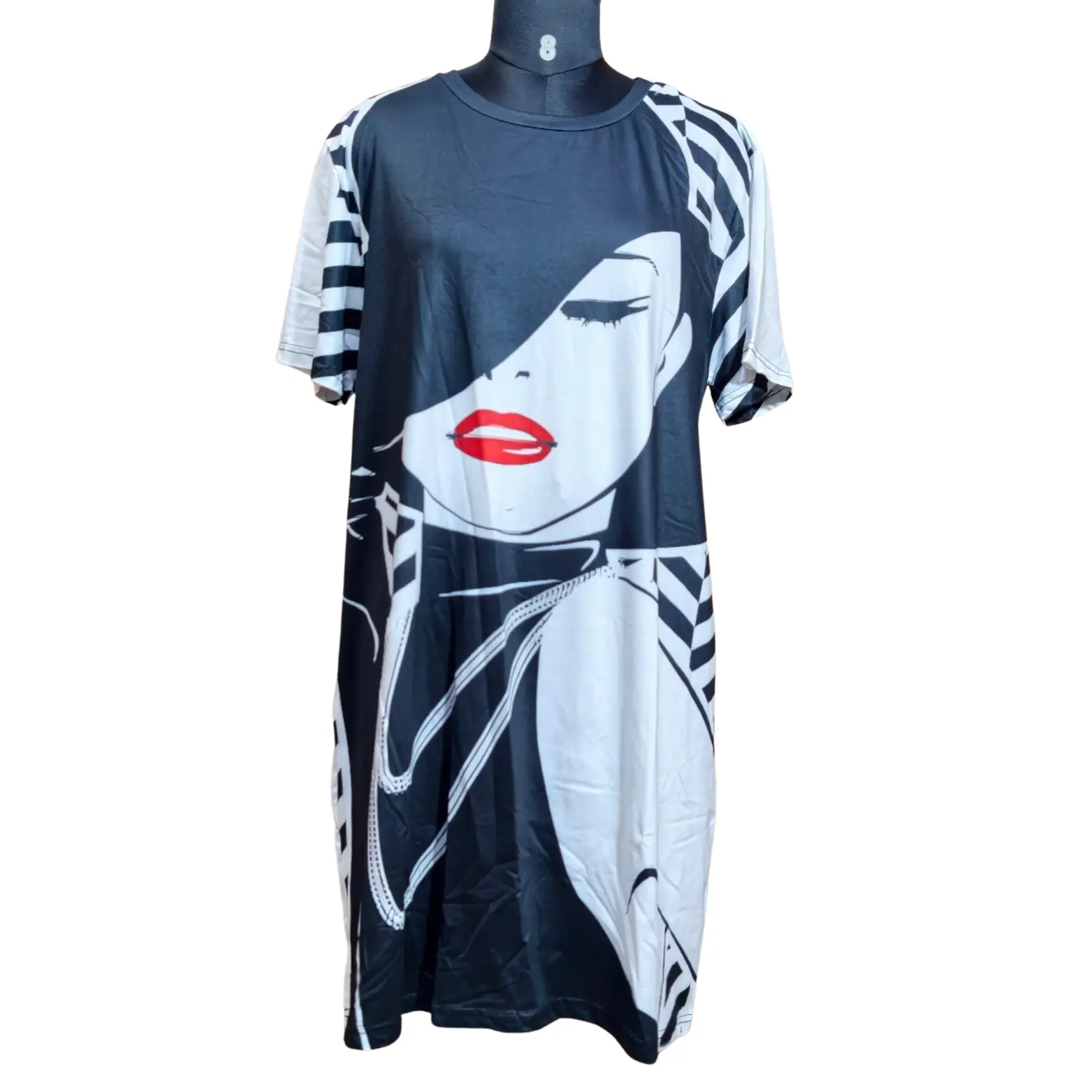 A striking t-shirt dress featuring a vibrant, cubist-inspired abstract face print in bold primary colors.